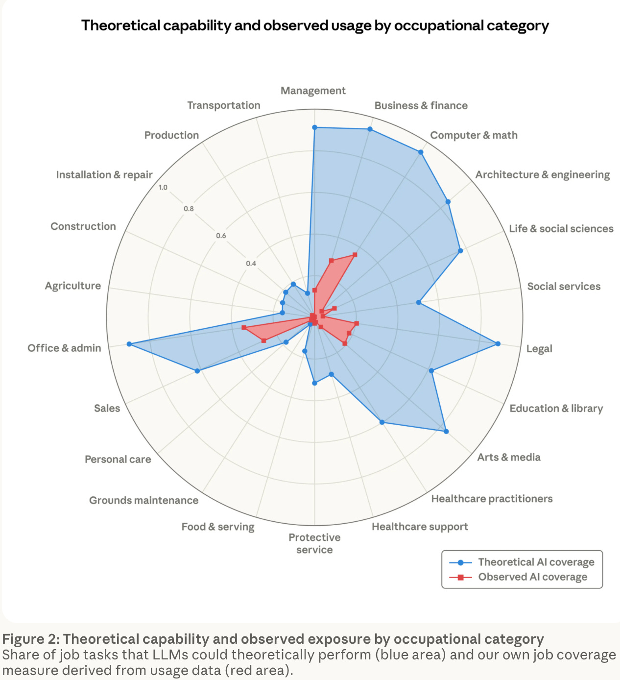 We all know that AI is roiling the working world. This diagram from last month’s Anthropic report on the labor marketshows what job types have already been impacted by AI (the red zone) and the company’s best guess at where things will go (the blue zone). I write to you from squarely in the red.